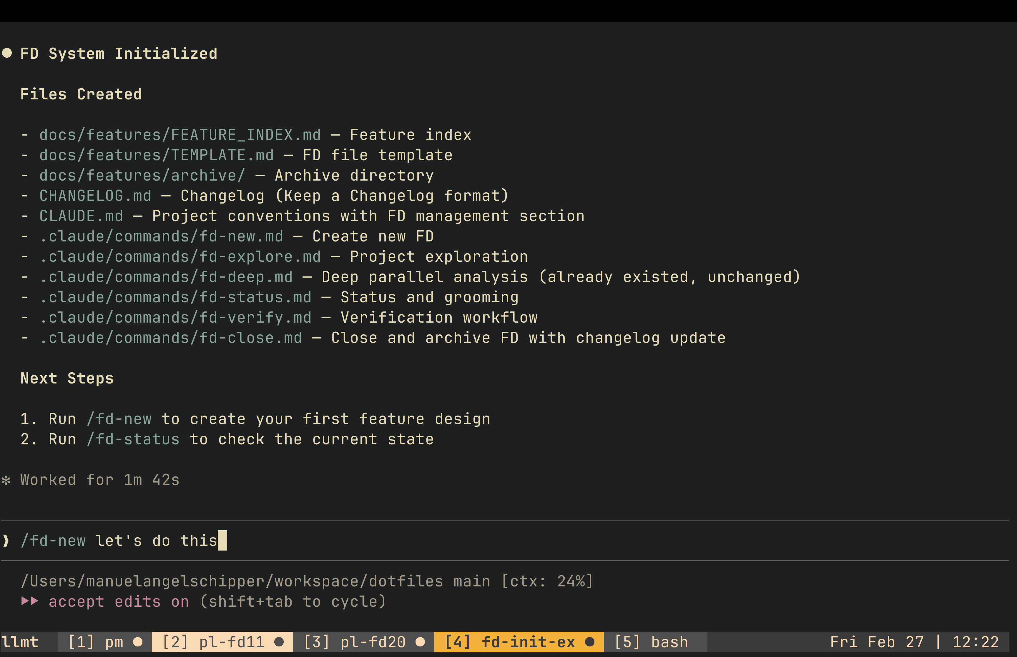 The original project’s FD system was built slowly over months. I wanted the same structure in every new project without repeating that work, so I packaged it as a slash command.